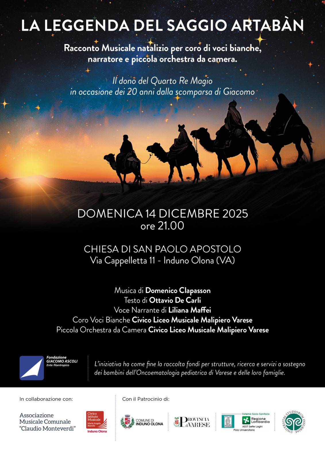 Dopo il successo della Leggenda del Saggio di Artabàn, proponiamo una replica del concerto in ricordo di Giacomo Ascoli, nel 20º anniversario della sua scomparsa, domenica 14 dicembre alle ore 21.00 presso la Chiesa San Paolo Apostolo in Via Cappelletta, 11, a Induno Olona, Varese.